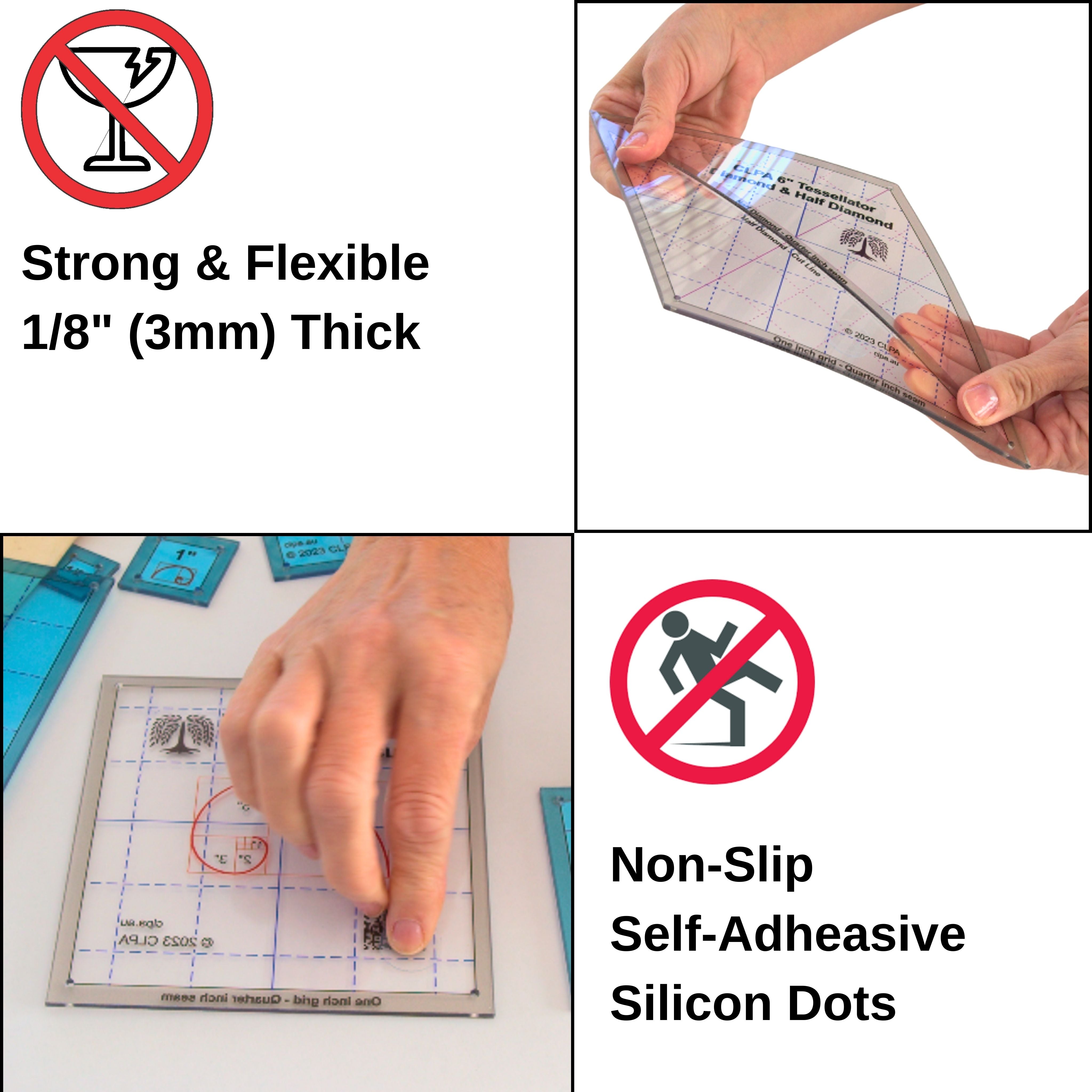 - Durable & Flexible Material; Crafted from flexible, non-brittle PETG plastic, these quilting rulers and templates resist breakage. The UV printing is clear and long-lasting. Supplied with adhesive dots so the quilting rulers are non-slip if desired.