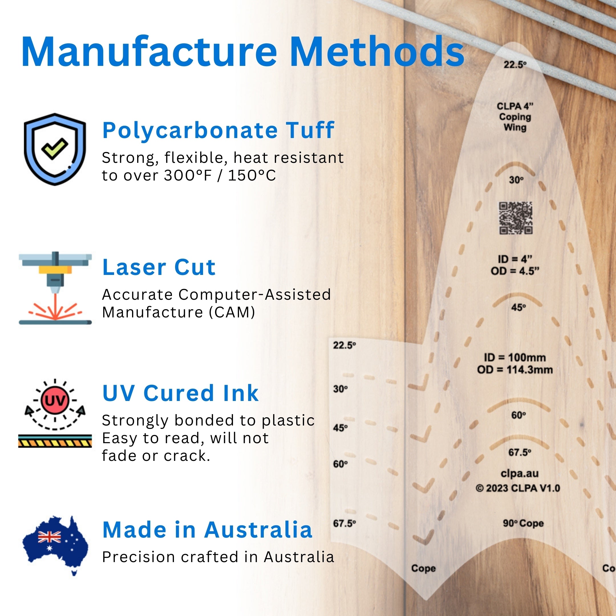 - Flexible and Polycarbonate Tuff; Being made from 0.4 mm clear polycarbonate makes this coping wing both super flexible and dimensionally stable, so it will not stretch, fray or warp over time. Polycarbonate is a strong plastic with a melting point of over 300 degrees Fahrenheit or 150 degrees Celsius for workshop survivability. Printing is with UV-cured and uv stable inks so will not fade or smear with time.